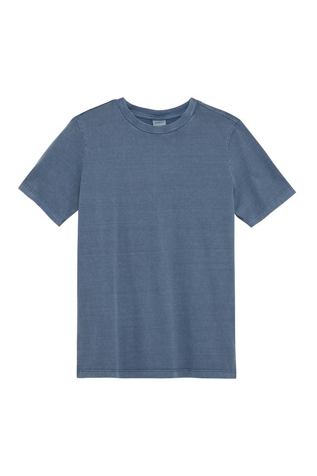 Футболка имеет классический крой с короткими рукавами и круглым вырезом горловины. Особенностью модели является слегка "помятый" эффект ткани, придающий ей более расслабленный и современный вид.