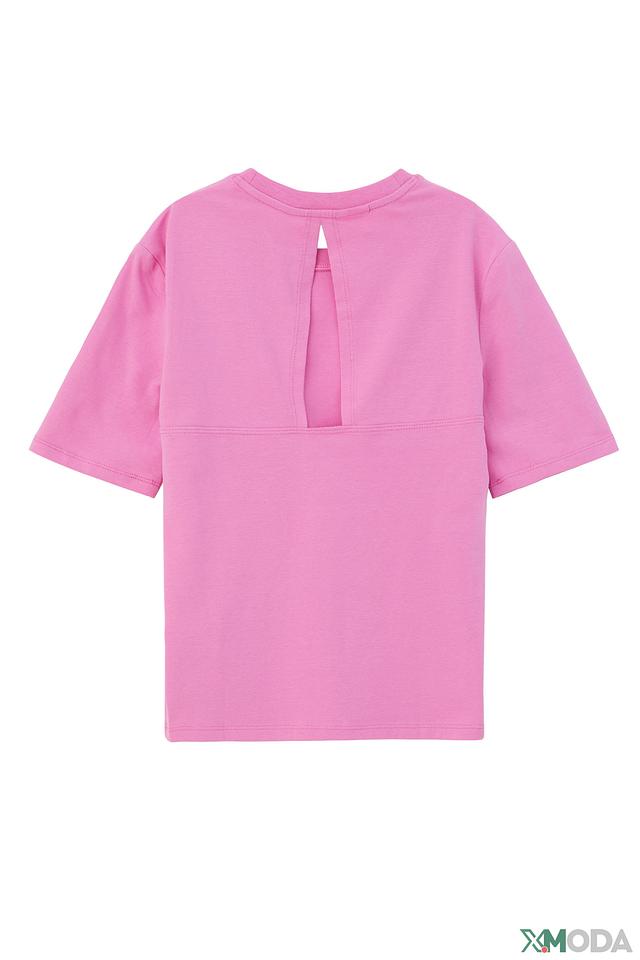 Модель имеет классический крой с короткими рукавами и круглым вырезом горловины. Оригинальным элементом дизайна является вырез на спине, который придает футболке особый шарм.