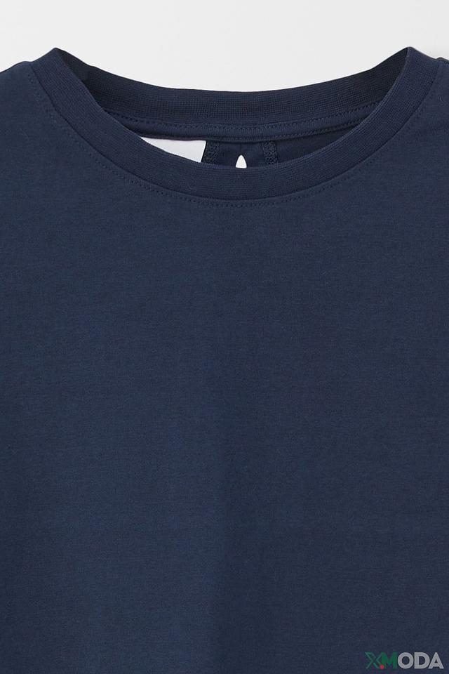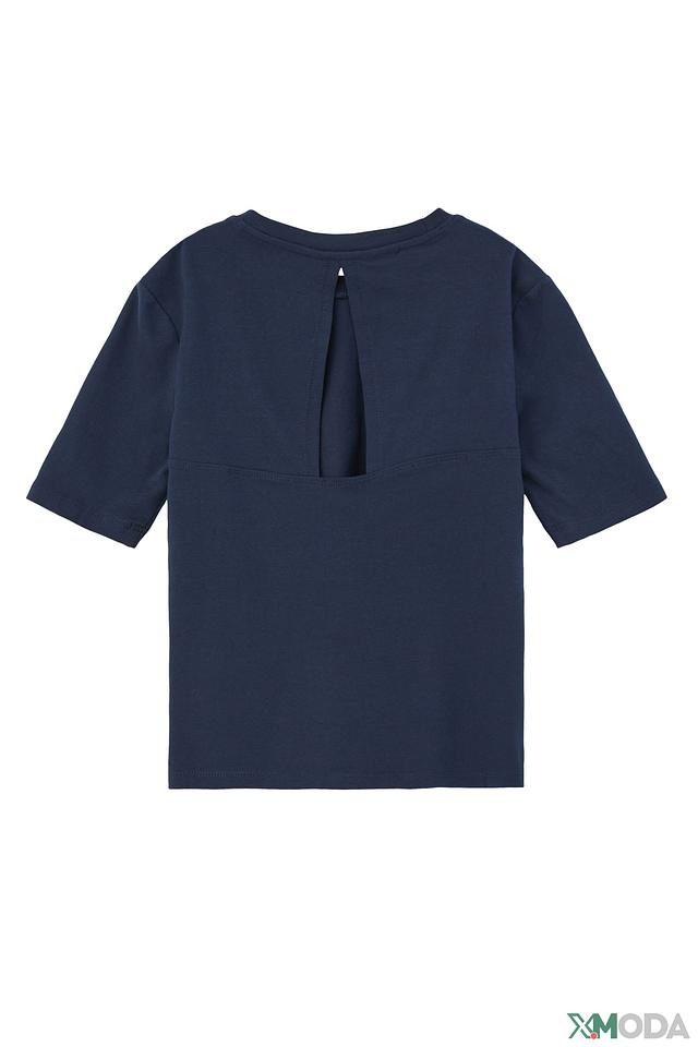 Футболка имеет классический крой, короткий рукав и круглый вырез горловины. Оригинальным элементом является небольшой вырез на спине, который добавляет модели изюминку.