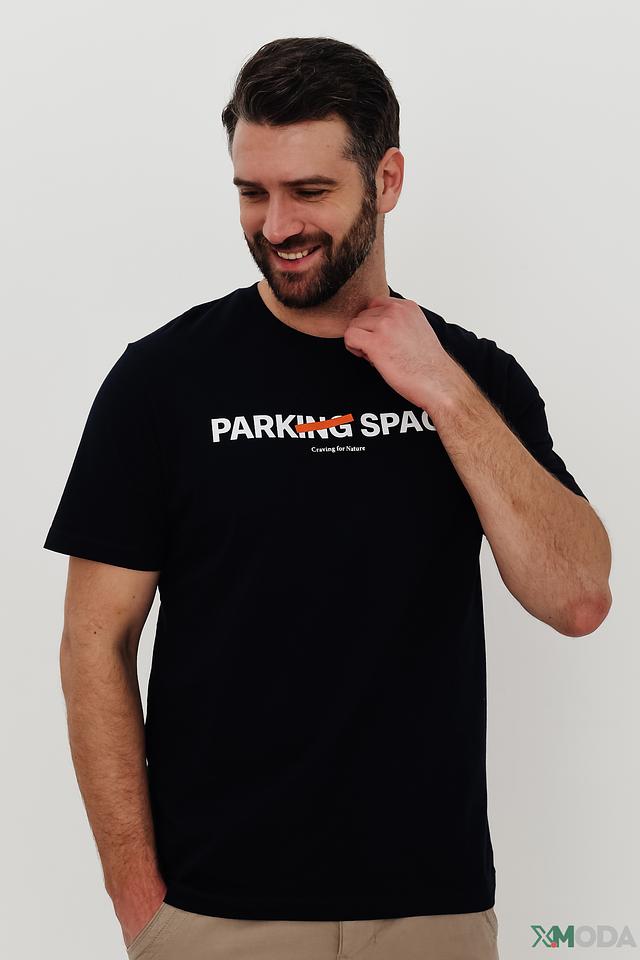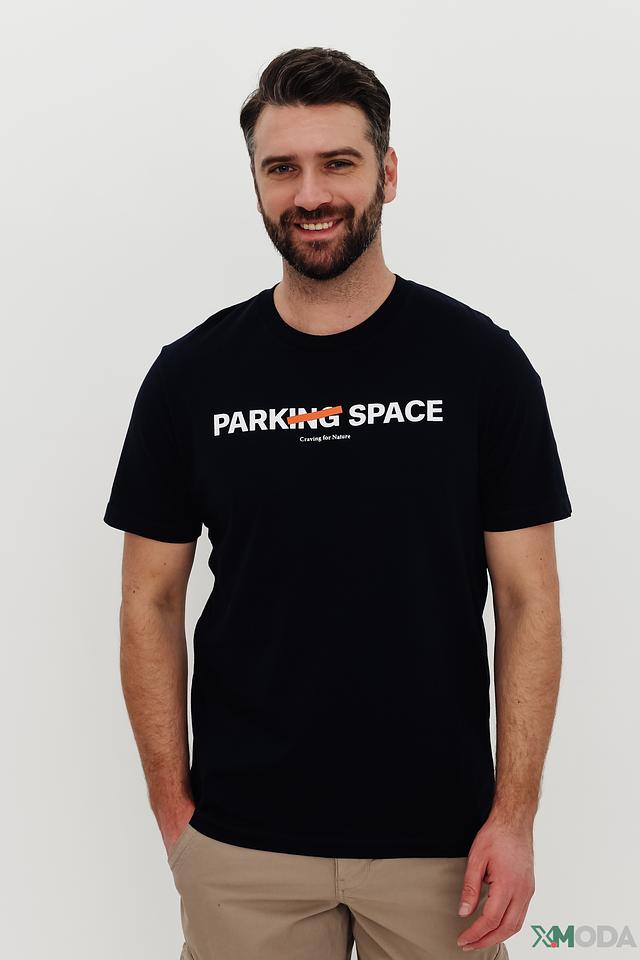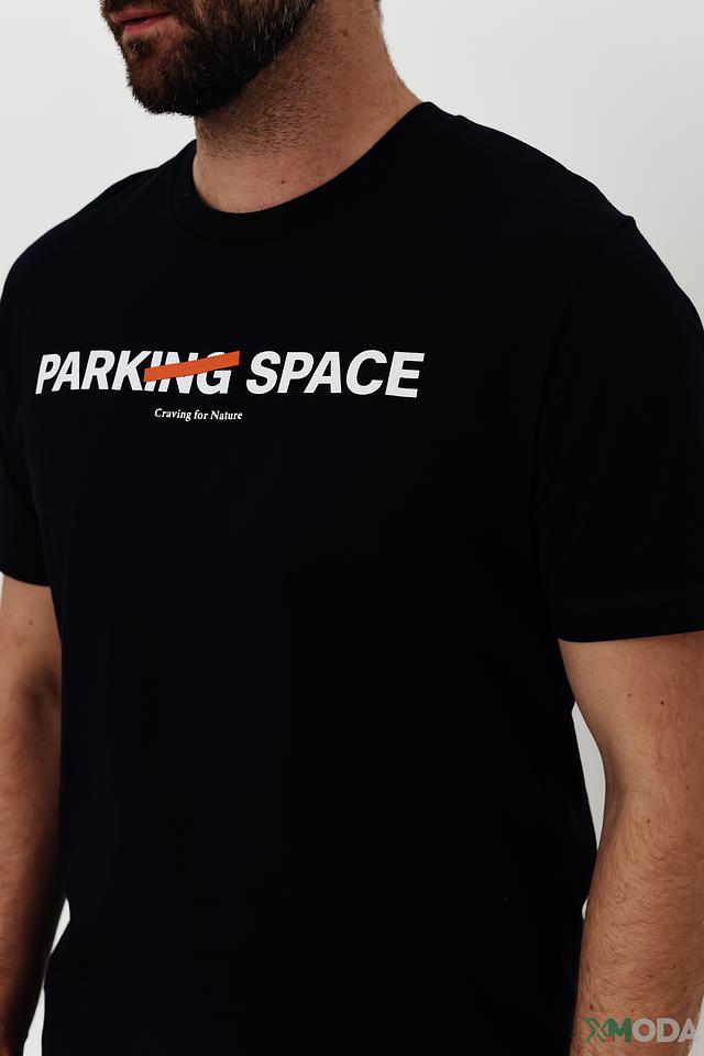 Основной цвет футболки – чёрный, что делает её универсальной и легко сочетаемой с другими элементами гардероба. На передней части футболки расположен яркий принт "PARKING SPACE", выполненный в белом и красном цветах, который добавляет образу индивидуальности.