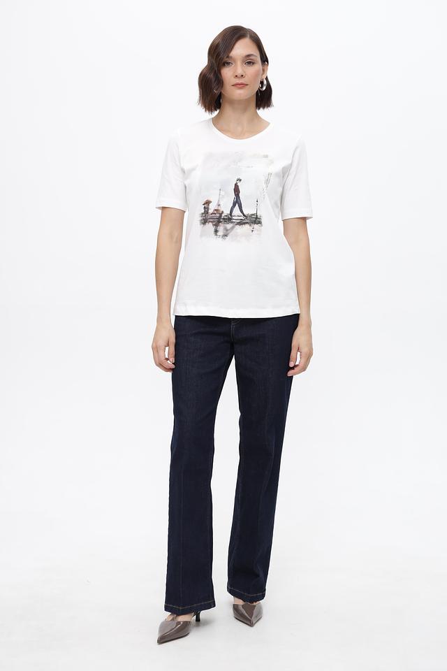 Футболка украшена стильным принтом с изображением парижских улиц и Эйфелевой башни, придающим образу романтичность и изысканность. Крой футболки - прямой, силуэт слегка приталенный, благодаря чему она хорошо подчеркивает фигуру.