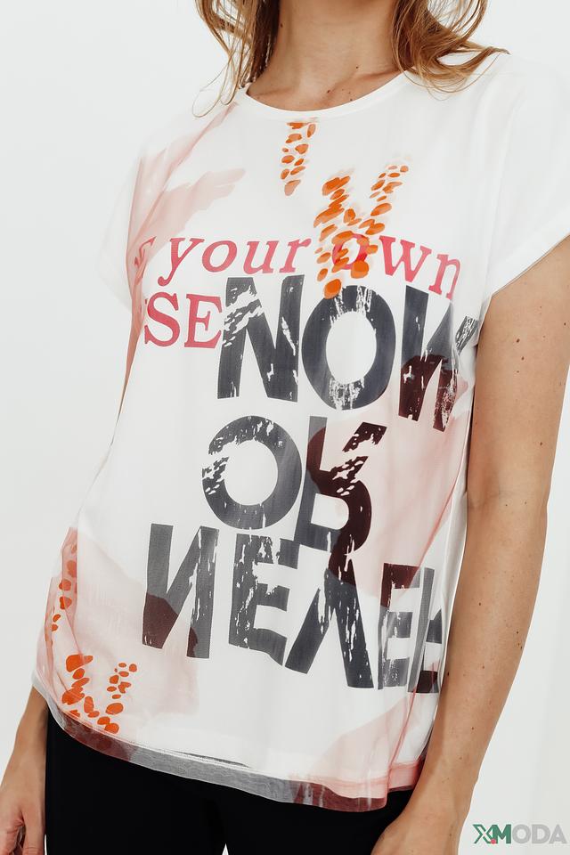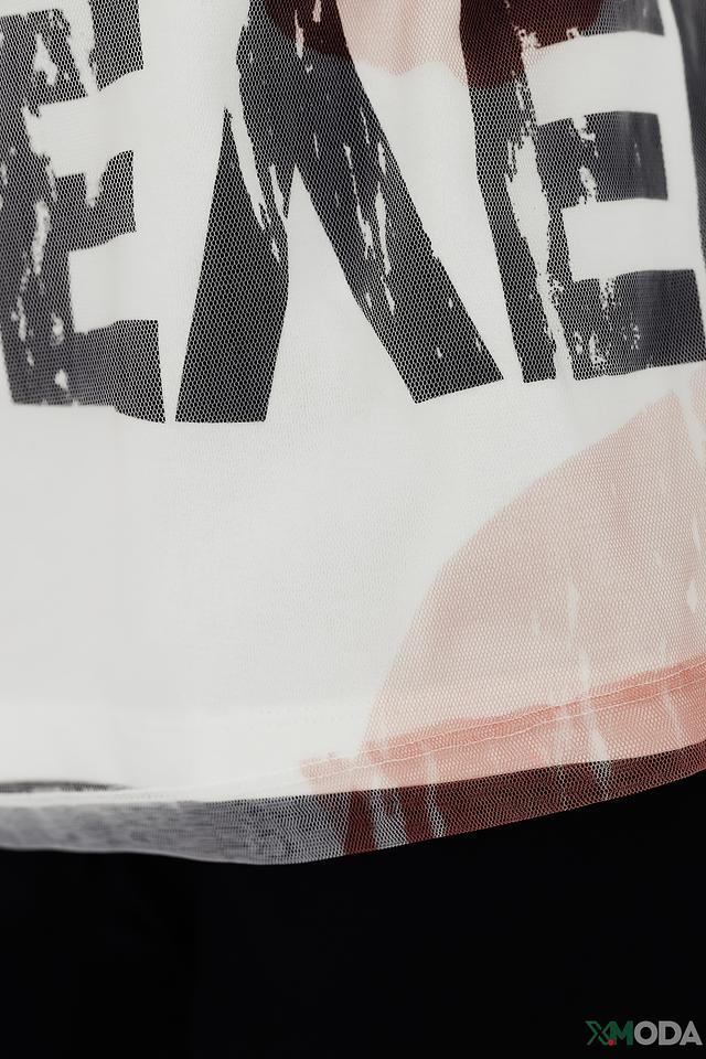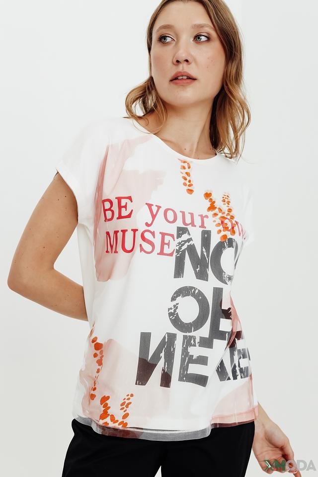 Футболка имеет свободный крой и короткие рукава-крылышки, что делает ее идеальной для теплой погоды. Главная особенность модели – яркий и запоминающийся принт с надписями и графическими элементами.