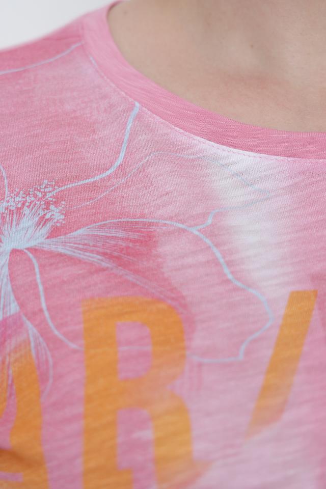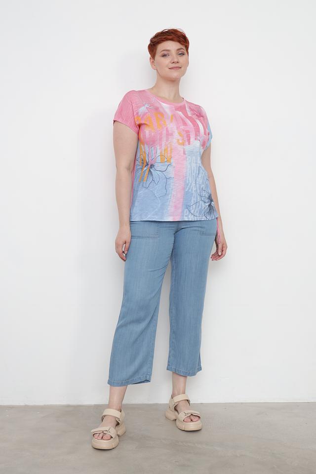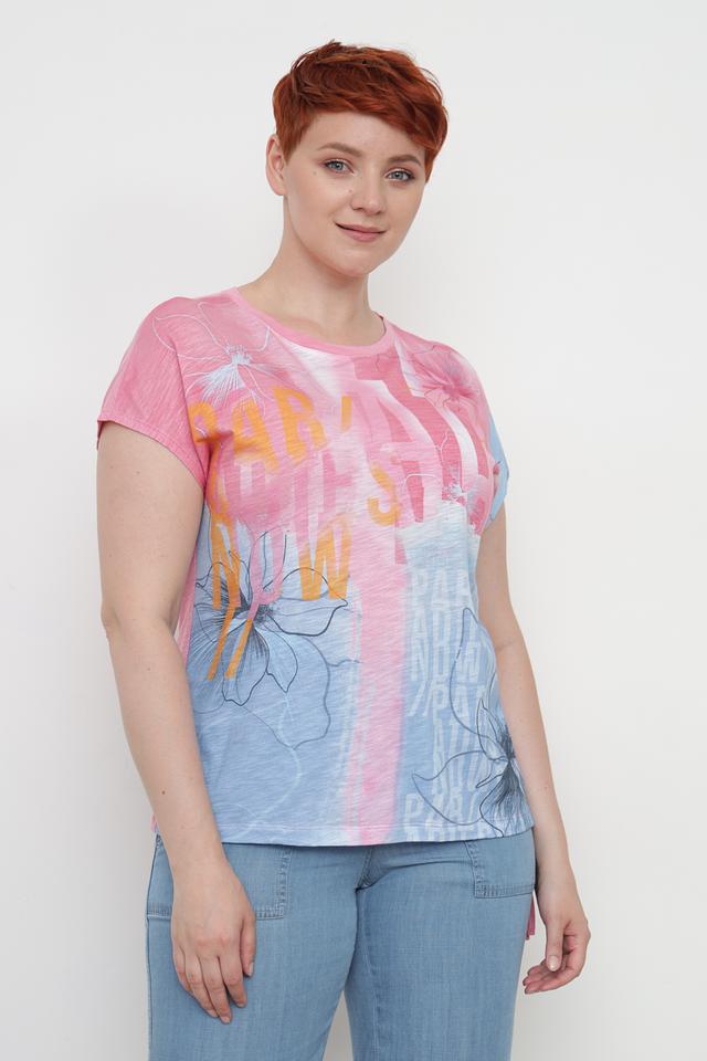 Женская футболка Thomas Rabe нежно-розового и голубого цвета с ярким цветочным принтом и надписями. Изготовлена из мягкой и приятной к телу ткани на основе вискозы и хлопка, обеспечивающей комфорт в носке. Состав: вискоза 50%, хлопок 50%
