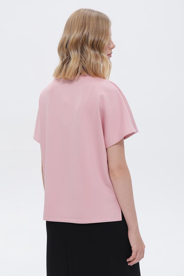 Изделие выполнено из приятного на ощупь трикотажа, в составе которого модал, полиэстер и эластан. Модал придает ткани мягкость и шелковистость, полиэстер обеспечивает форму и износостойкость, а эластан — небольшую эластичность.