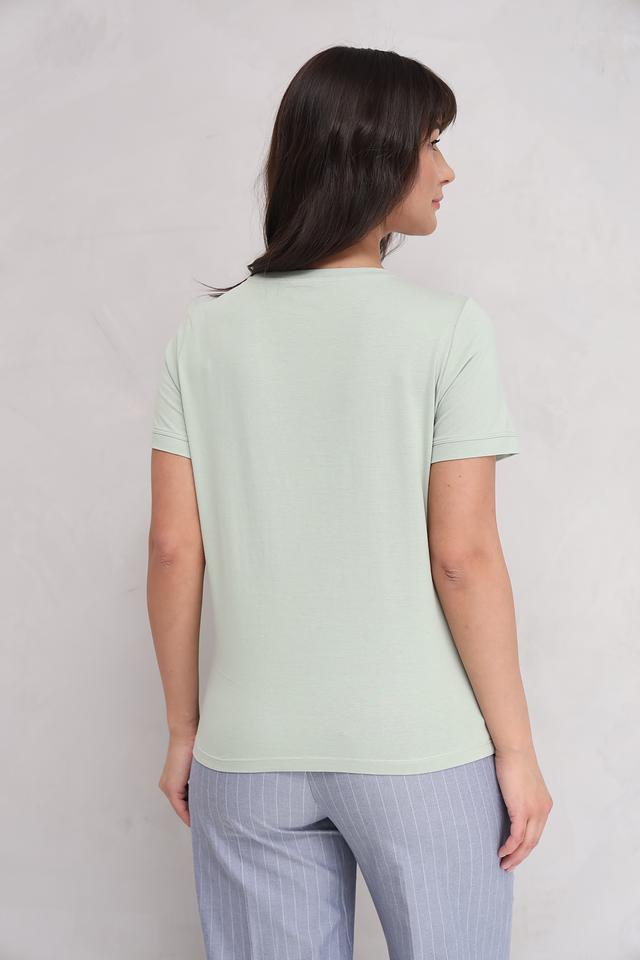 Футболка имеет классический прямой крой и короткий рукав. Особенностью модели является лаконичный дизайн и надпись с логотипом бренда на груди, выполненная в тон изделия. Благодаря своему универсальному мятному цвету, эта футболка легко сочетается с различными элементами одежды, позволяя создавать разнообразные образы.