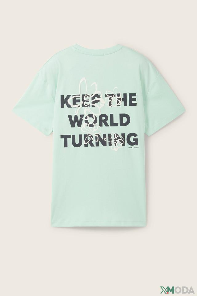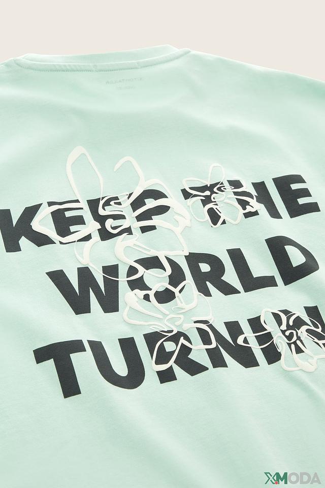 Модель имеет классический крой с короткими рукавами и круглым вырезом горловины. На передней части футболки расположен яркий принт с надписью "KEEP THE WORLD TURNING", выполненный в черном цвете.