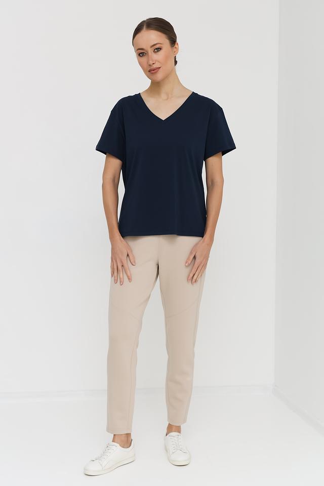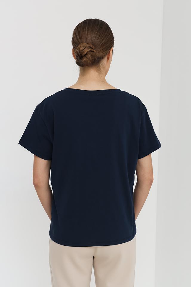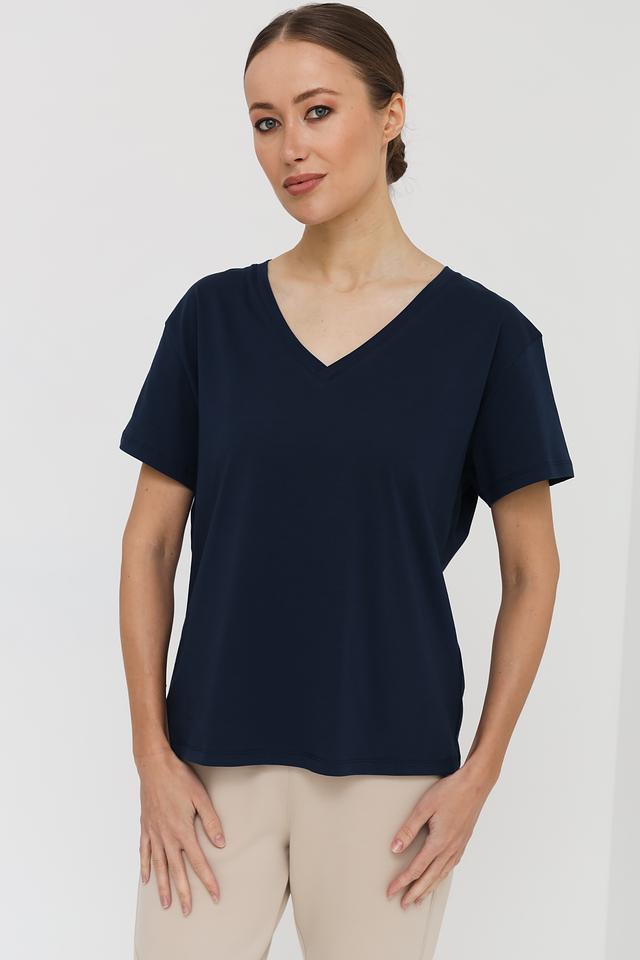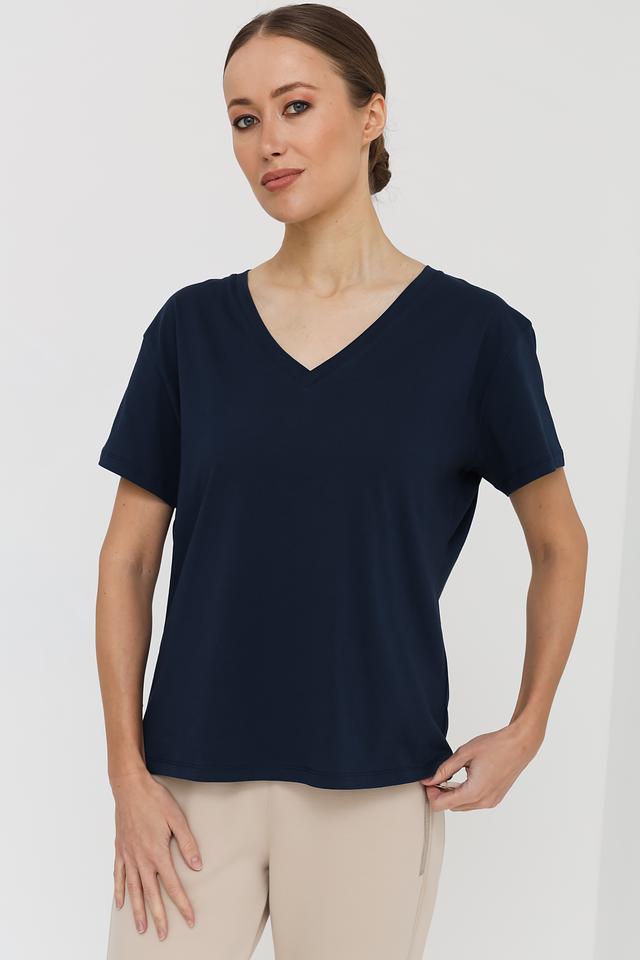 Женская футболка UNQ темно-синего цвета с V-образным вырезом. Изготовлена из 100% хлопка, обеспечивающего комфорт и воздухопроницаемость. Базовая модель для создания повседневных образов. Состав: хлопок 100%