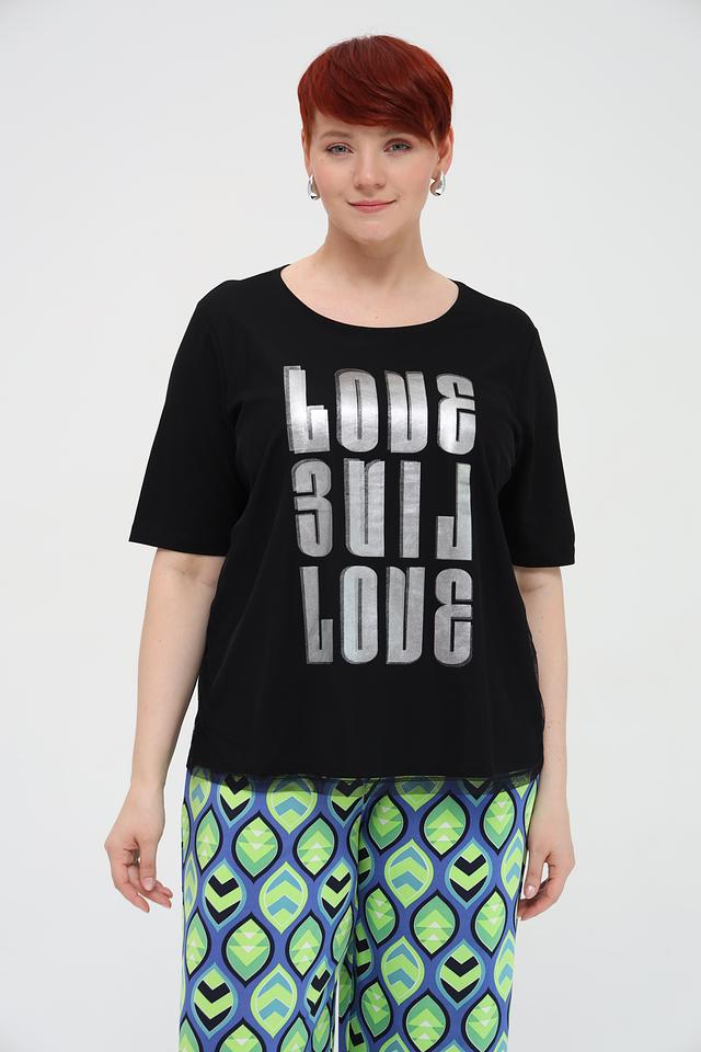 Чёрная футболка Via Appia с оригинальным серебристым принтом "LOVE BUILD LOVE" станет стильным дополнением к вашему гардеробу. Изготовлена из мягкого и приятного к телу сочетания хлопка и модала. Состав: хлопок 50%, модал 50%