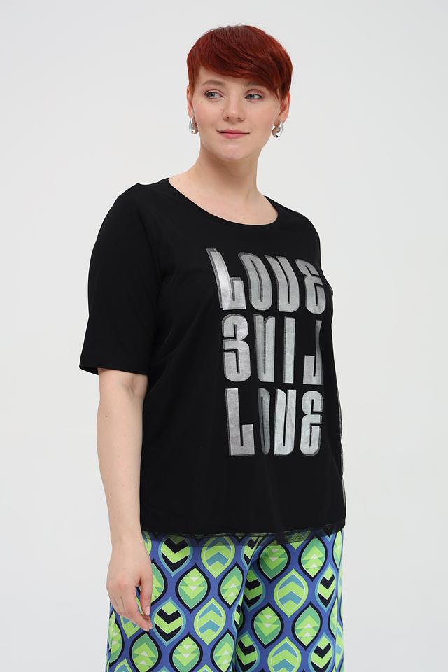 Эта футболка от Via Appia – отличный выбор для создания повседневного образа. Она выполнена в классическом чёрном цвете и украшена эффектным серебристым принтом с надписью "LOVE BUILD LOVE".
