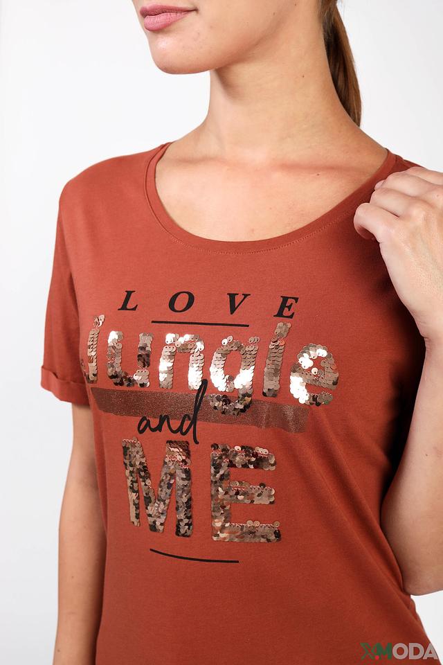 Основной цвет футболки – терракотовый, который отлично сочетается с различными оттенками. Фасад украшен эффектным принтом с надписью "LOVE Jungle and ME", выполненным с использованием блестящих пайеток, что придает изделию особый шарм и привлекательность.