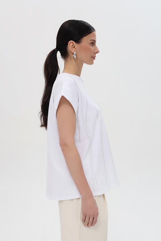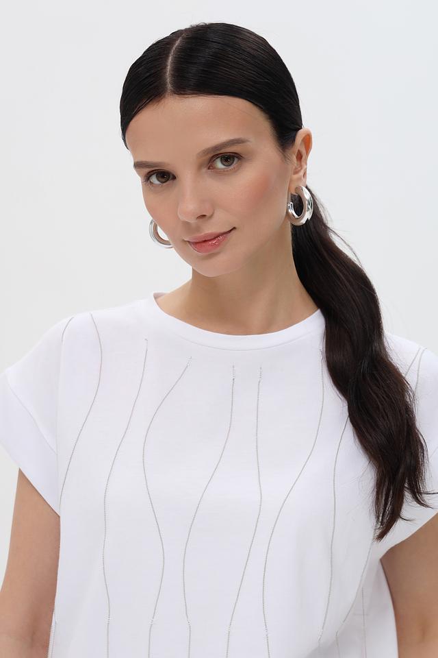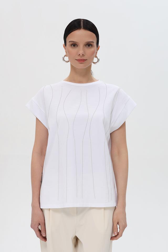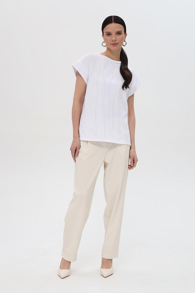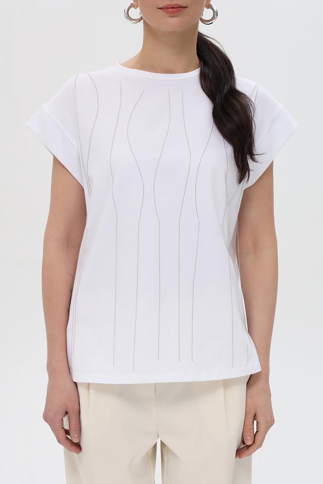 Особенностью данной модели является вертикальная фактура, которая визуально вытягивает силуэт и добавляет изюминку образу. Короткие рукава и свободный крой делают футболку удобной для ношения в теплую погоду.