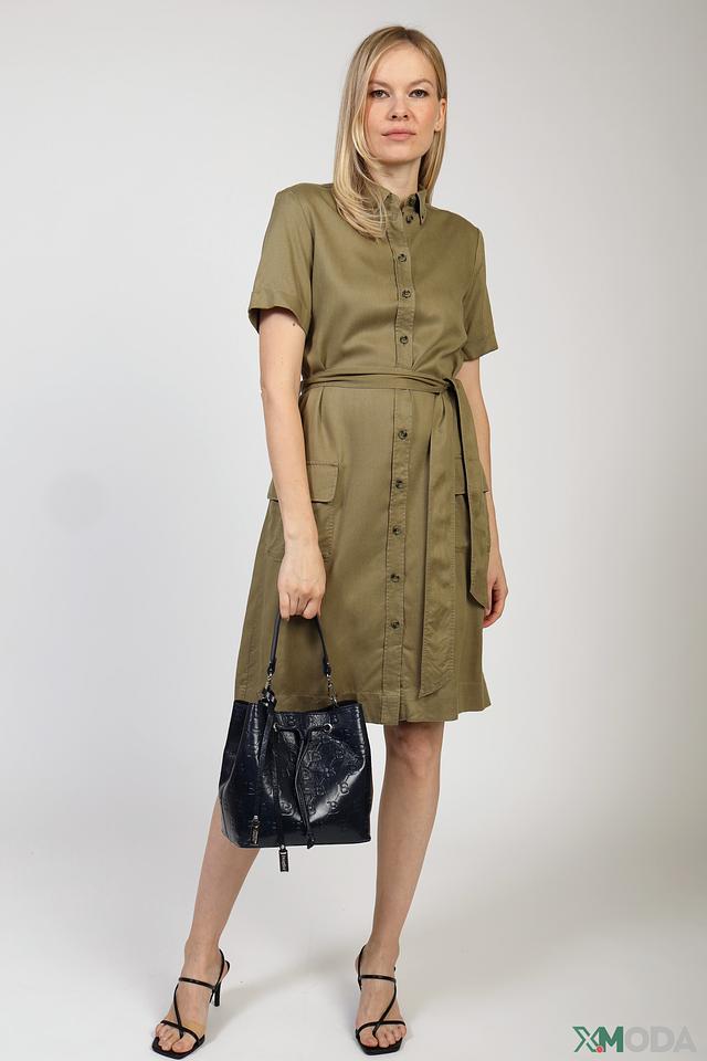 Модель отличается стильным дизайном в стиле casual: воротник рубашка, застежка на пуговицы по всей длине, пояс, подчеркивающий талию, и накладные карманы на груди. Цвет платья — хаки, который легко сочетается с различными элементами гардероба.