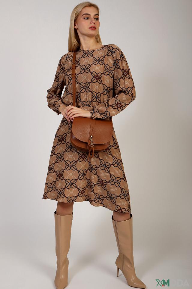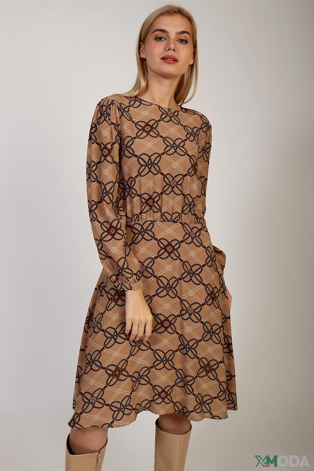 Модель имеет длину миди, длинные рукава и округлый вырез горловины. Главной особенностью платья является оригинальный принт в клетку, выполненный в бежево-коричневой гамме. Талия слегка приталена и подчеркнута сборкой, что придает платью женственный силуэт.