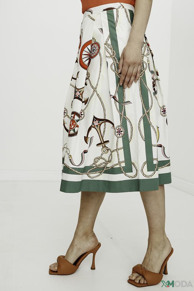 Юбка имеет классический крой и длину миди, что делает ее универсальной для различных случаев. Изготовлена из высококачественного 100% хлопка, который приятен к телу и обеспечивает комфорт в жаркую погоду.