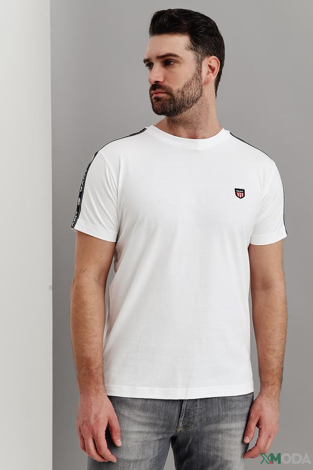 Классический крой и лаконичный дизайн делают эту футболку универсальной и подходящей для различных стилей. На груди расположен фирменный логотип Gant, добавляющий узнаваемости. Черная полоса с надписью "GANT" на рукаве придает модели динамичный и современный вид.