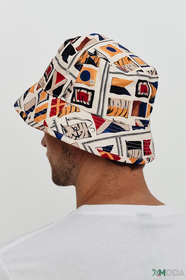 Дизайн панамы выполнен в яркой цветовой гамме с оригинальным принтом, изображающим морские мотивы – корабли, якоря и геометрические фигуры. Такой рисунок придаёт аксессуару индивидуальность и динамичный вид.