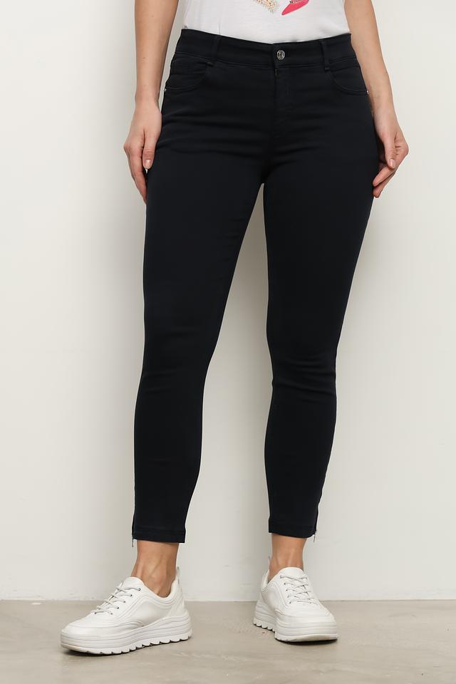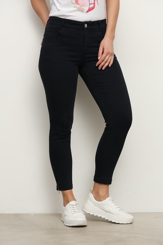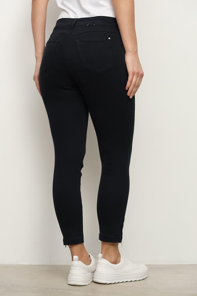 Особенностью данной модели являются декоративные молнии на щиколотках, которые добавляют брюкам современный и дерзкий вид. Классический крой и тёмный цвет делают эти брюки универсальными и подходящими для любого случая. Они легко сочетаются с различными видами обуви и верхней одежды.
