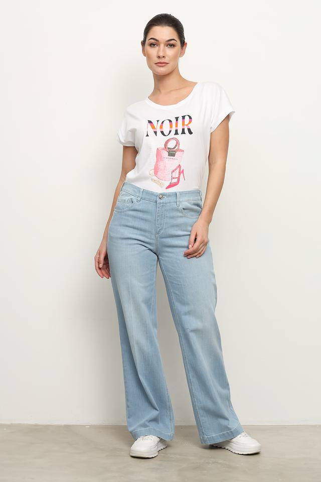Джинсы имеют классический крой клеш, который визуально удлиняет ноги и придает силуэту женственность. Деликатный потертый эффект добавляет джинсам непринужденности и индивидуальности. Высокая посадка подчеркивает талию и обеспечивает комфортную посадку.