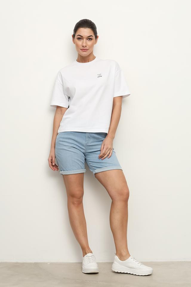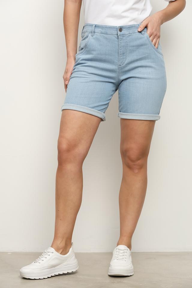 Модель имеет классический голубой цвет и зауженный крой, который подчеркивает фигуру. Подвернутые штанины добавляют образу непринужденности и стиля. Шорты застегиваются на молнию и пуговицу, а также оснащены удобными карманами.