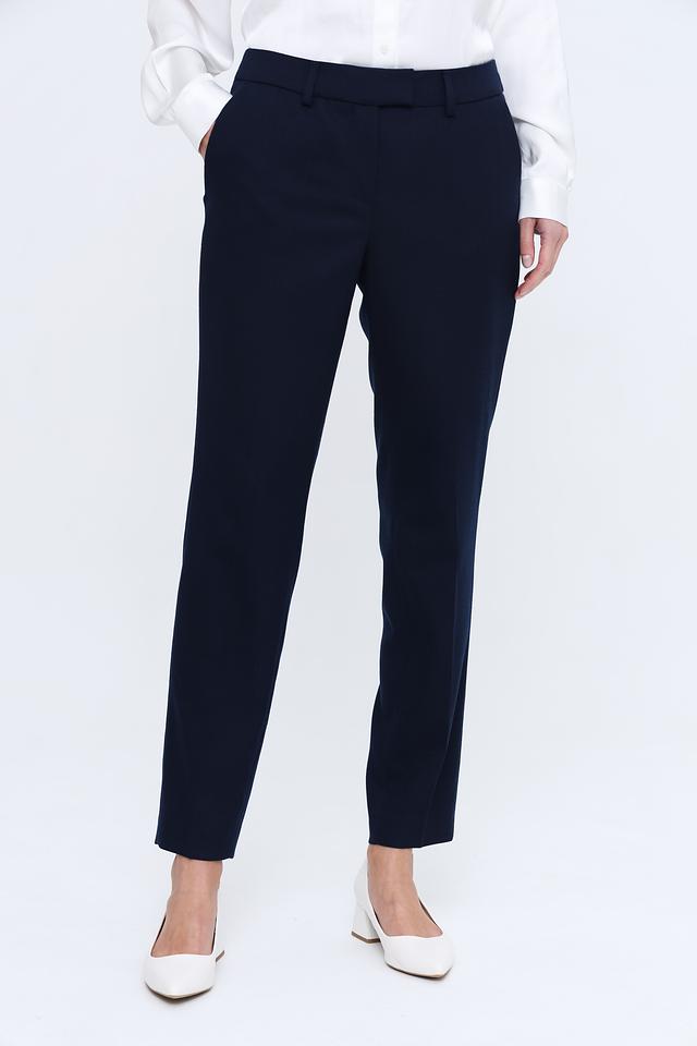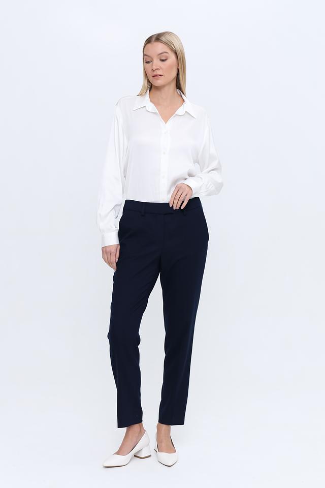 Брюки имеют прямой крой, стандартную посадку по талии и застежку на молнию с пуговицей. Ткань состоит из полиэстера (63%), вискозы (34%) и эластана (3%), что обеспечивает комфорт в носке, хорошую посадку и устойчивость к сминанию.