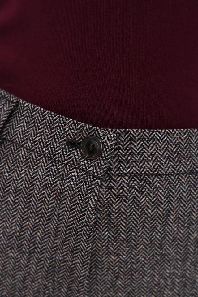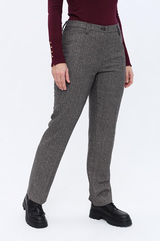Брюки имеют серый цвет с характерным рисунком "принц Уэльский", который придает им особый шарм. Ткань состоит из 50% шерсти, 29% полиэстера, 20% хлопка и 1% эластана, что обеспечивает комфорт в носке и сохранение формы.