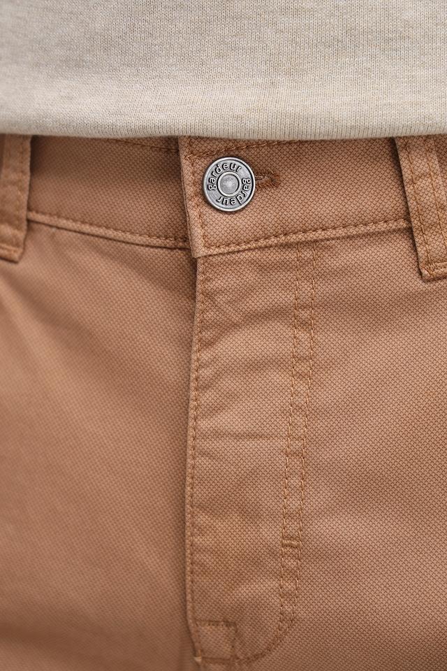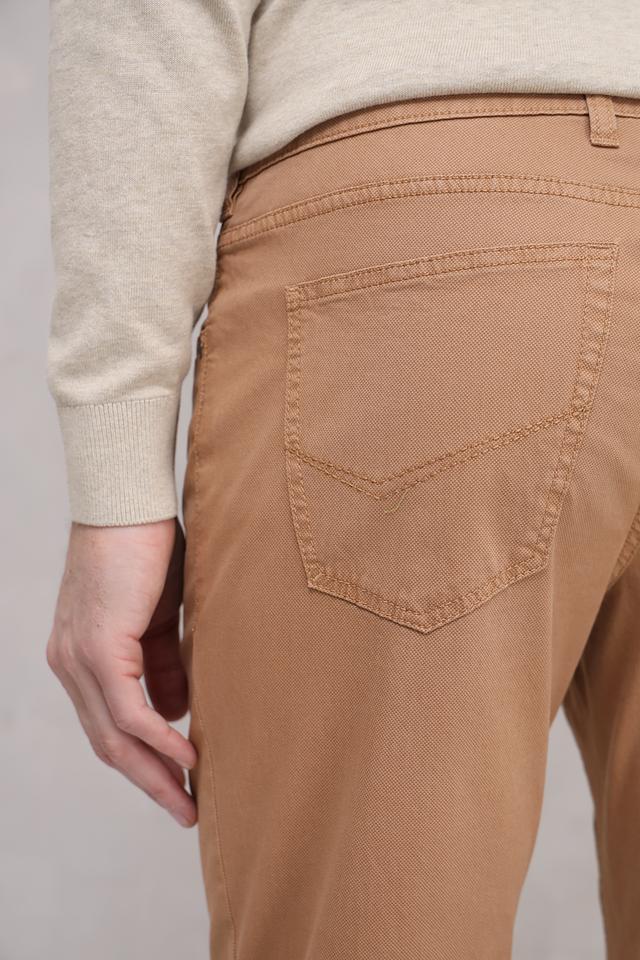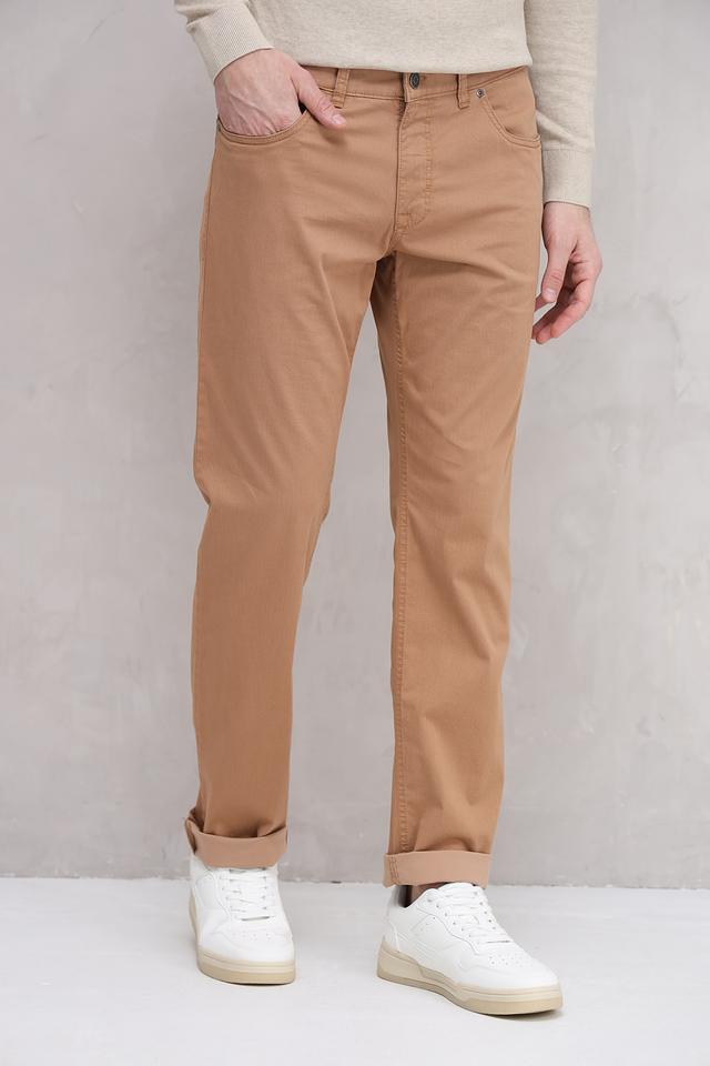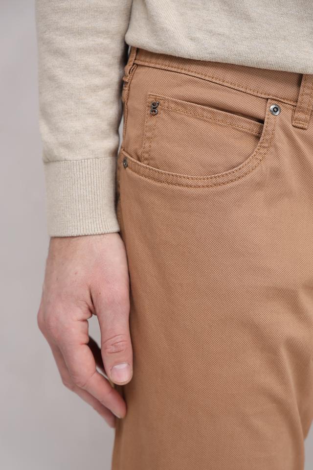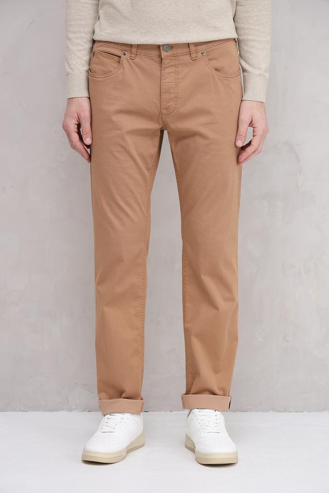 Брюки выполнены из высококачественного хлопка с добавлением эластана, что придает им мягкость, комфорт и небольшую эластичность. Цвет брюк – насыщенный коричневый, который легко сочетается с различными элементами гардероба.