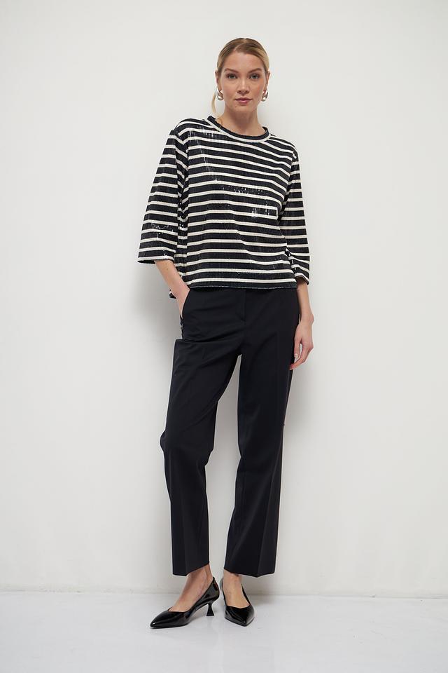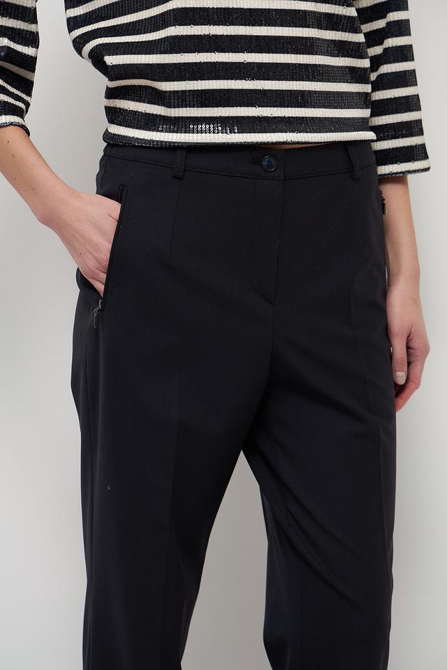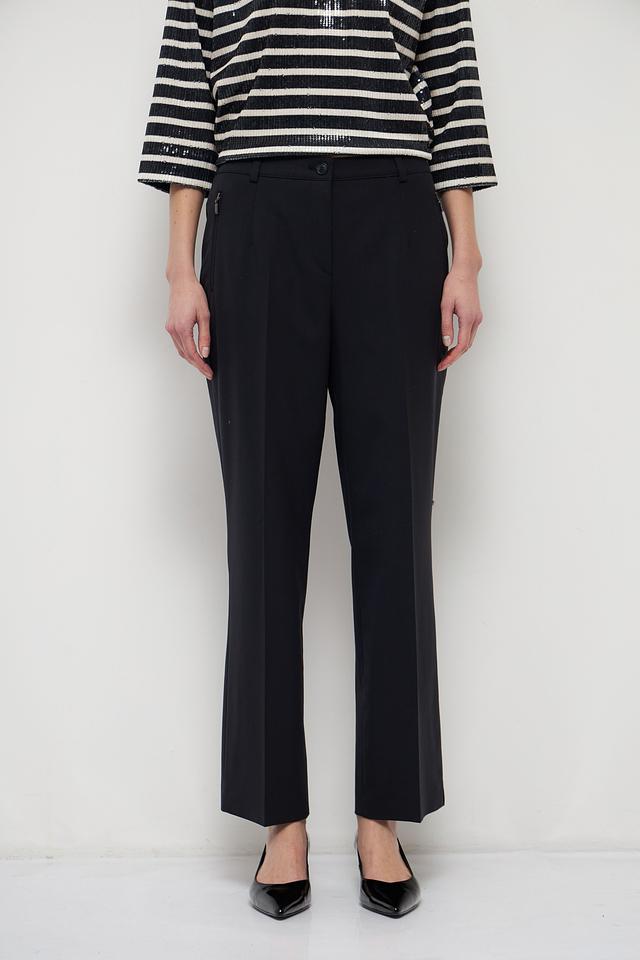 Брюки имеют прямой крой, который обеспечивает свободу движений и подходит для разных типов фигуры. Высокое качество материалов гарантирует комфорт при носке и долговечность изделия. Состав брюк: 54% полиэстер, 41% шерсть, 5% эластан.