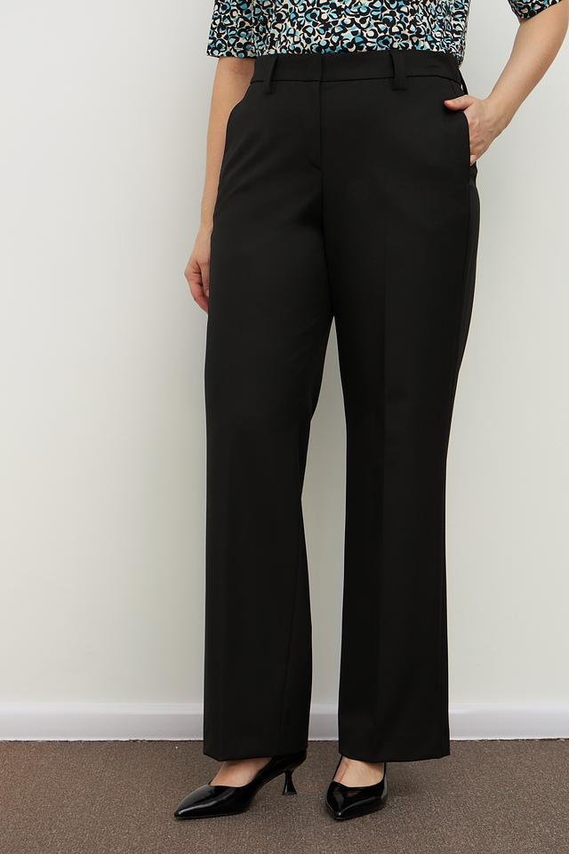 Брюки имеют прямой крой, который визуально вытягивает силуэт и подходит для любого типа фигуры. Высокая посадка обеспечивает комфортную посадку по талии. Застежка на молнию и пуговицу, а также наличие классических карманов по бокам и сзади.