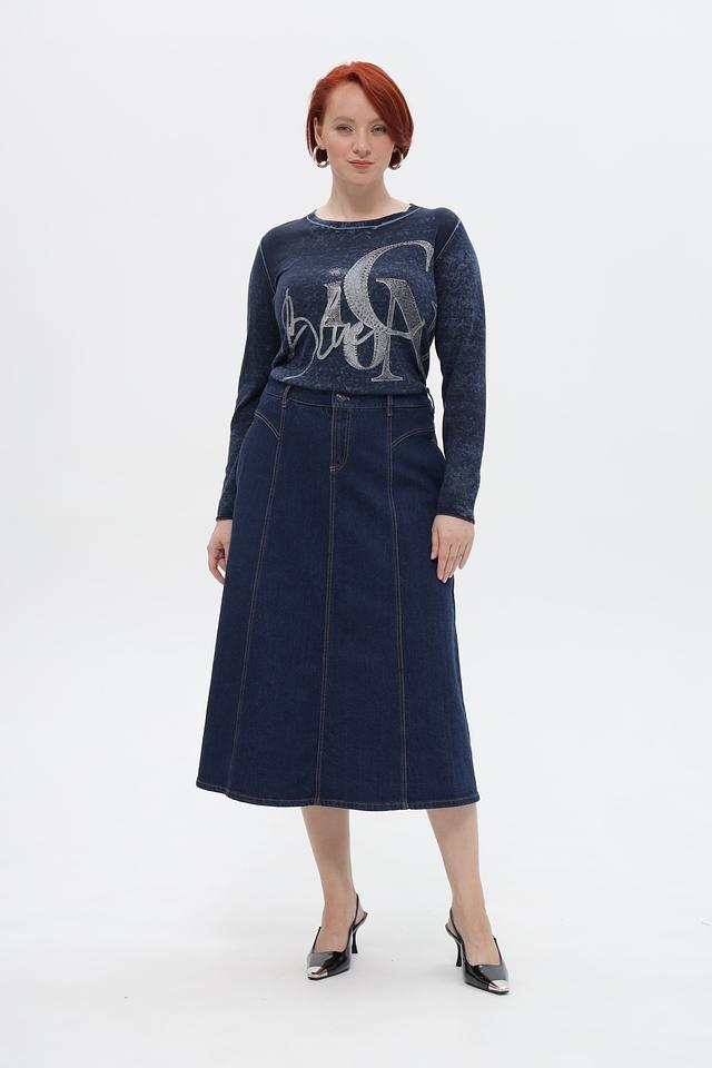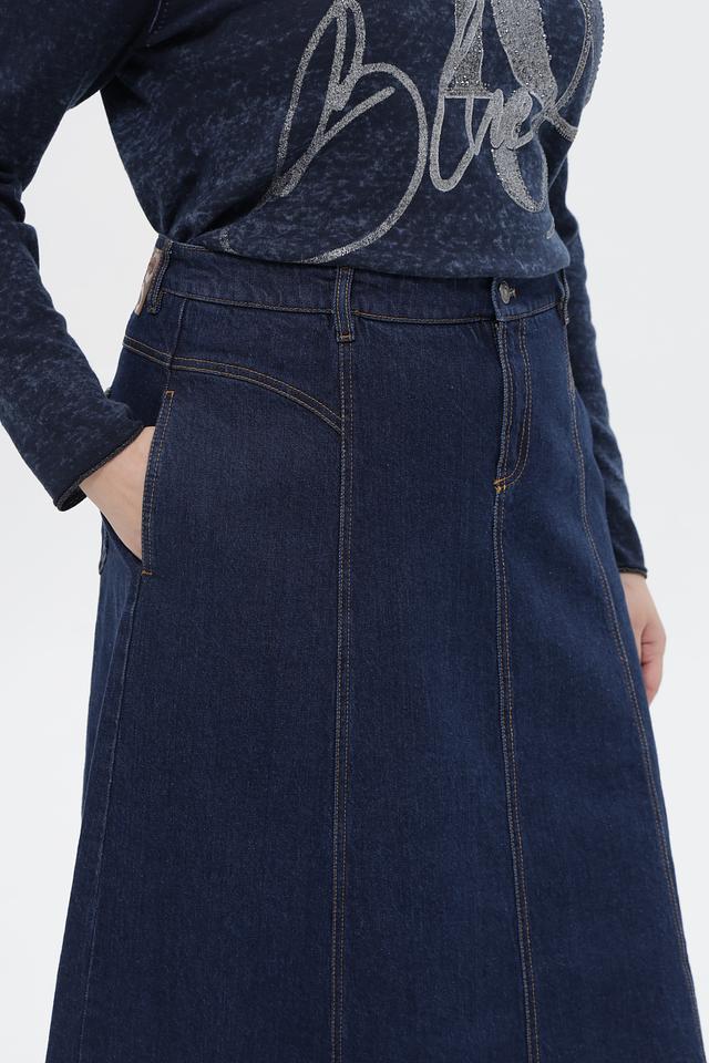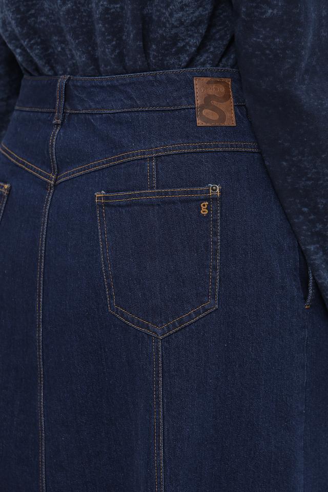 Модель имеет пояс с шлевками для ремня, классические джинсовые карманы спереди и сзади. Застёжка выполнена на молнию. Темные швы придают юбке завершенный вид. Эта юбка станет незаменимой вещью в вашем гардеробе и отлично сочетается с различными видами верхней одежды и обуви.