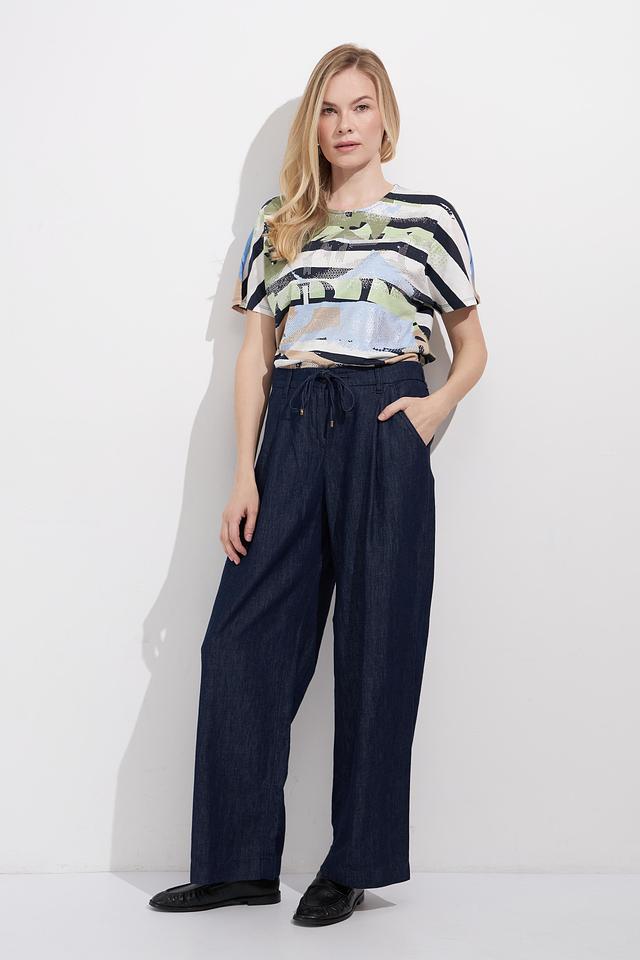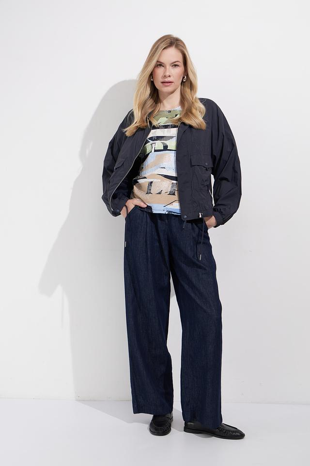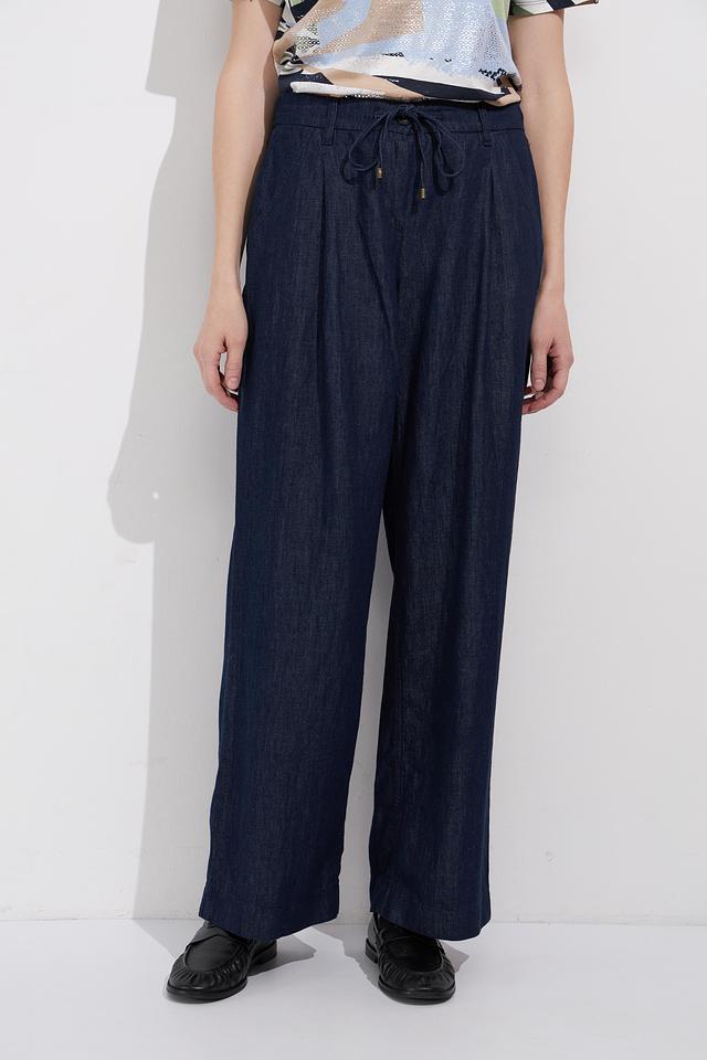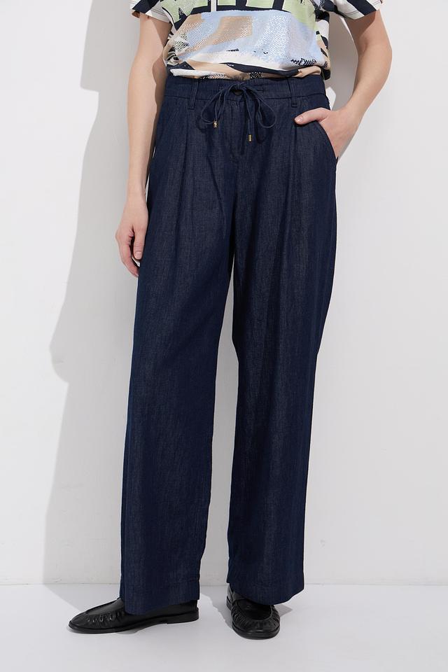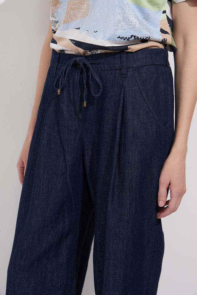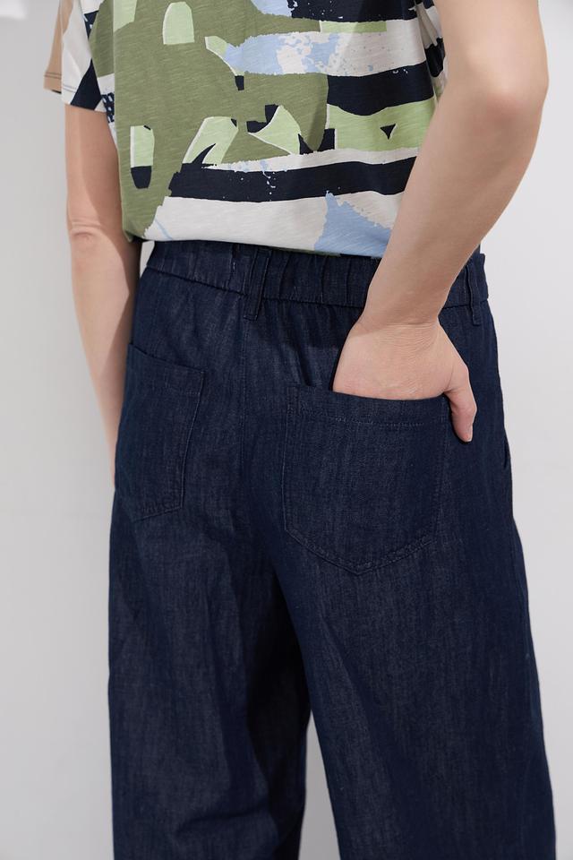 Синие брюки Gardeur прямого кроя с эластичным поясом и декоративной отделкой. Модель выполнена из хлопка с добавлением лиоцела и льна, что обеспечивает комфорт и воздухопроницаемость. Состав: хлопок 67%, лиоцел 17%, лен 16%