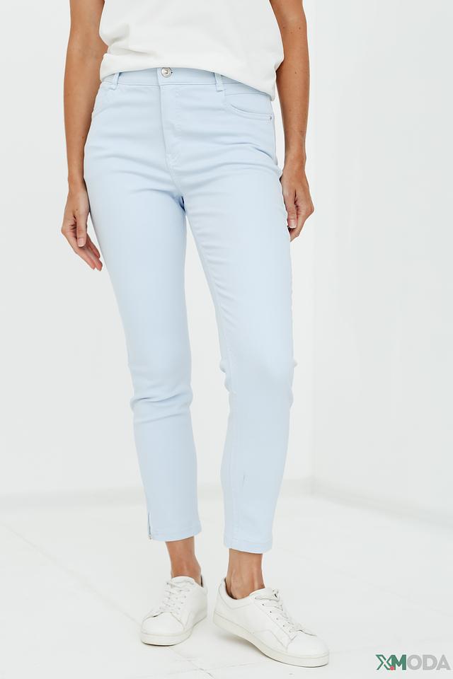 Модель имеет классический голубой цвет и зауженный крой, который подчеркивает фигуру. Капри оснащены удобным поясом и функциональными карманами. Декоративная молния на щиколотке добавляет образу изюминку и позволяет регулировать ширину штанины.