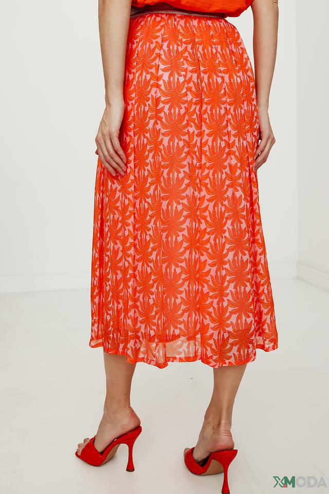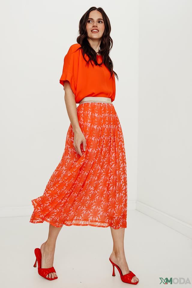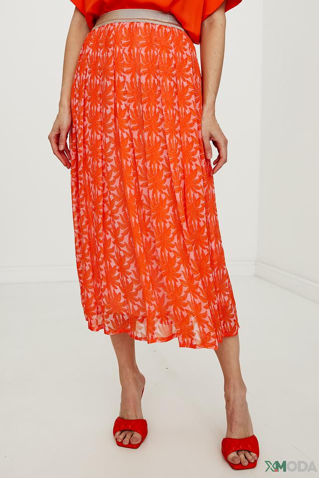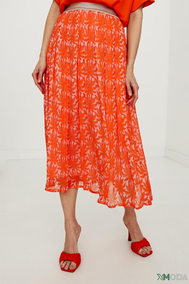 Юбка имеет длину миди и плиссированную фактуру, что придает ей элегантный и женственный вид. Оранжевый цвет и эффектный цветочный принт делают эту модель особенно привлекательной.