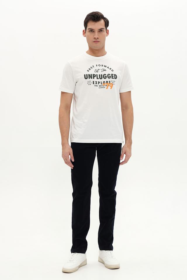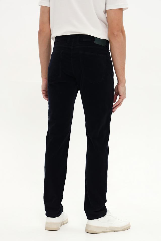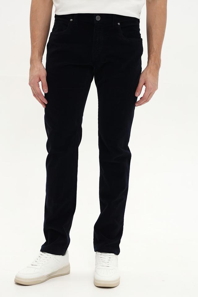 Брюки имеют классический темно-синий цвет, который легко сочетается с различными элементами гардероба. Прямой крой и стандартная посадка делают их универсальным выбором для мужчин любого телосложения. На поясе расположены петли для ремня, а также предусмотрены функциональные карманы.