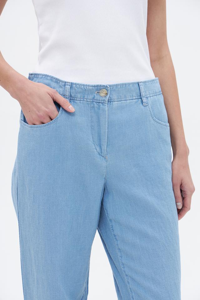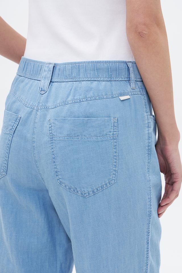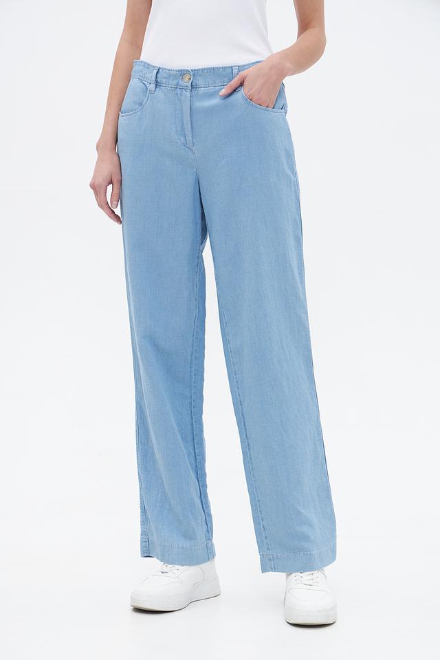 Женские брюки Gardeur голубого цвета прямого кроя, выполнены из хлопка с добавлением льна и лиоцелла. Модель с эластичным поясом и боковыми карманами для комфортной носки. Состав: хлопок 50%, лен 25%, лиоцел 25%