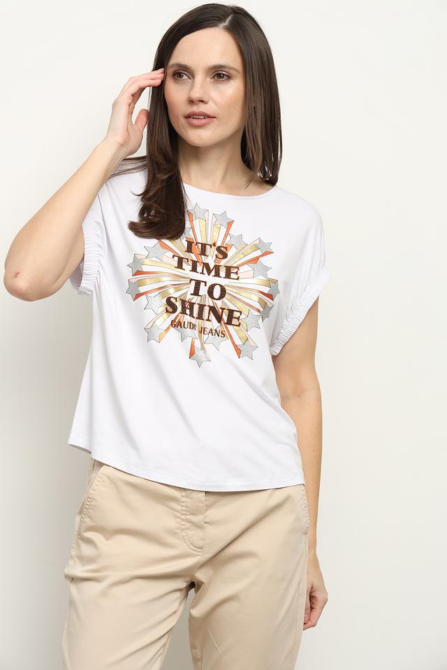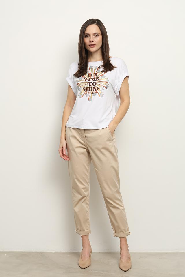 Белая футболка от Gaudi с ярким принтом "It's Time to Shine" станет стильным дополнением к вашему образу. Модель выполнена из мягкой вискозы с добавлением эластана, обеспечивающего комфорт при носке. Состав: вискоза 95%, эластан 5%