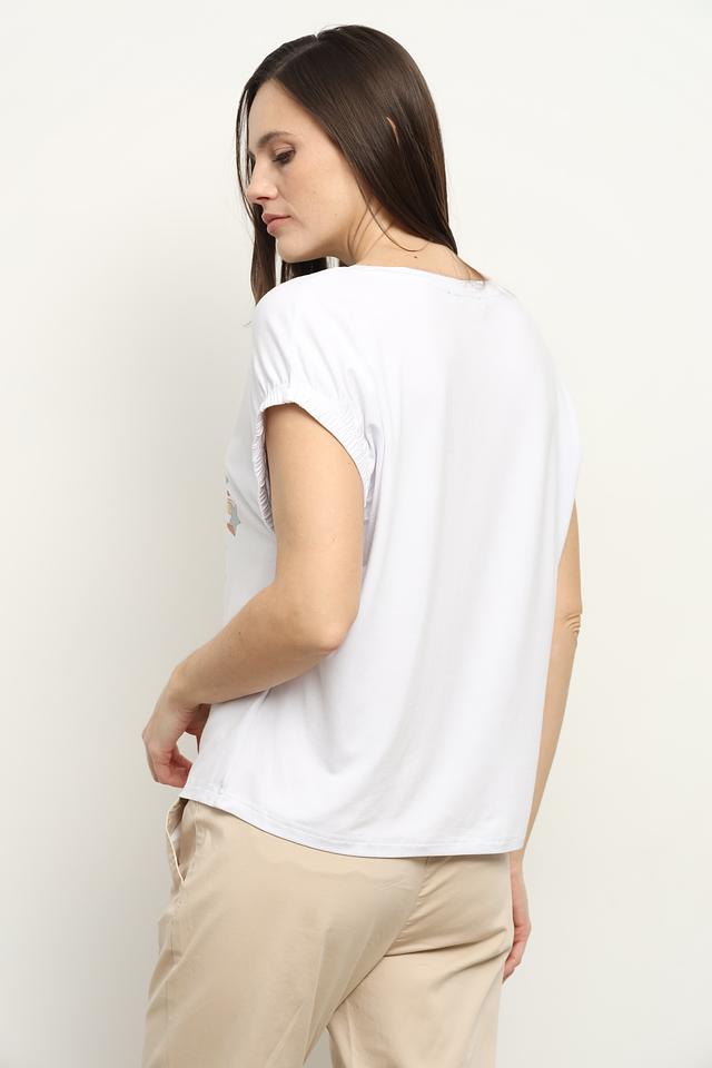 Эта белая футболка от Gaudi – отличный выбор для создания повседневного, но выразительного образа. Модель имеет прямой крой и короткие рукава с небольшими сборками по плечу, что придает ей лёгкость и воздушность.