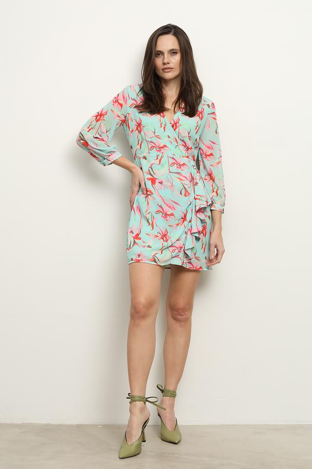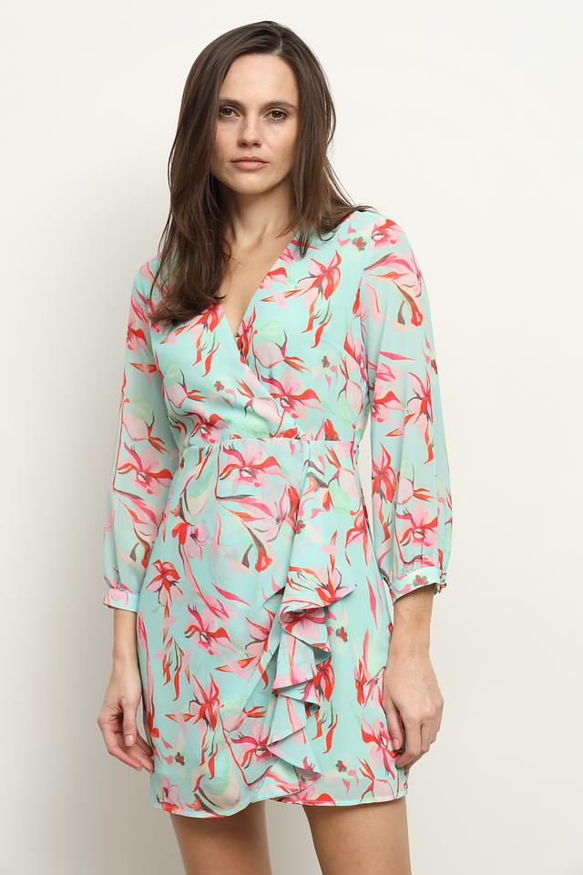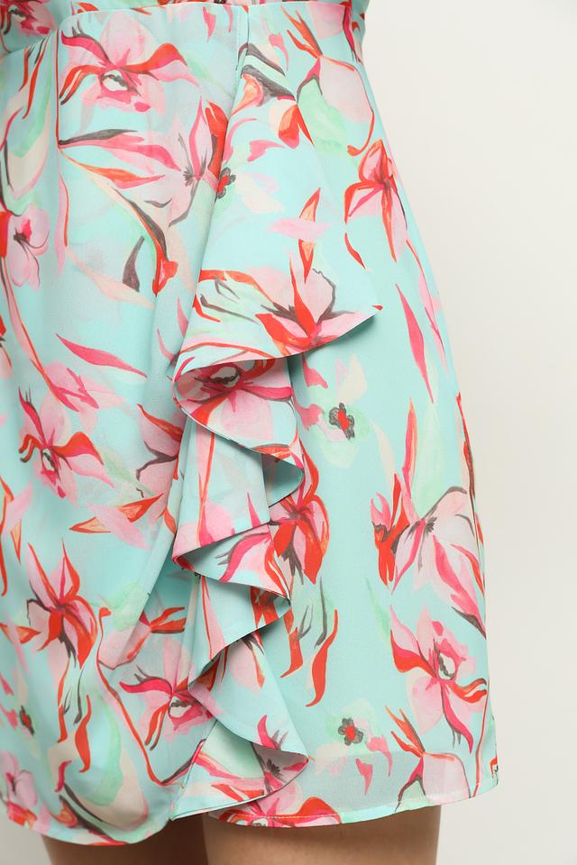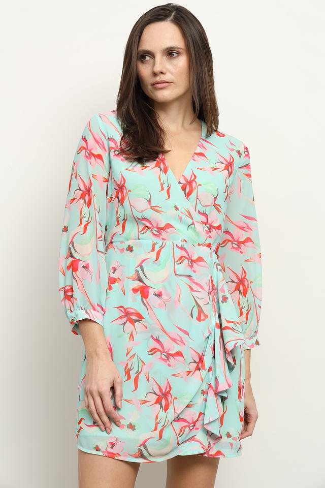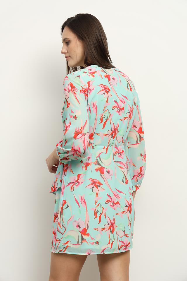 Модель имеет приталенный силуэт, V-образный вырез и короткие рукава 3/4 с манжетами. Платье украшено ярким цветочным принтом на бирюзовом фоне, который придает ему свежесть и лёгкость. Асимметричный волан на юбке добавляет образу динамичности и игривости.