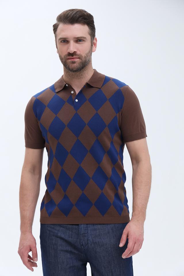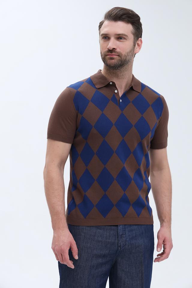 Мужское поло Gaudi коричневого цвета с геометрическим принтом в виде ромбов. Изготовлено из 100% хлопка, обеспечивающего комфорт и воздухопроницаемость. Стильный и универсальный выбор для повседневного гардероба. Состав: хлопок 100%