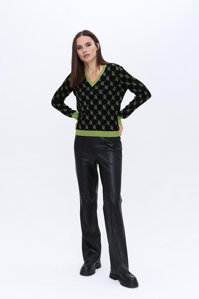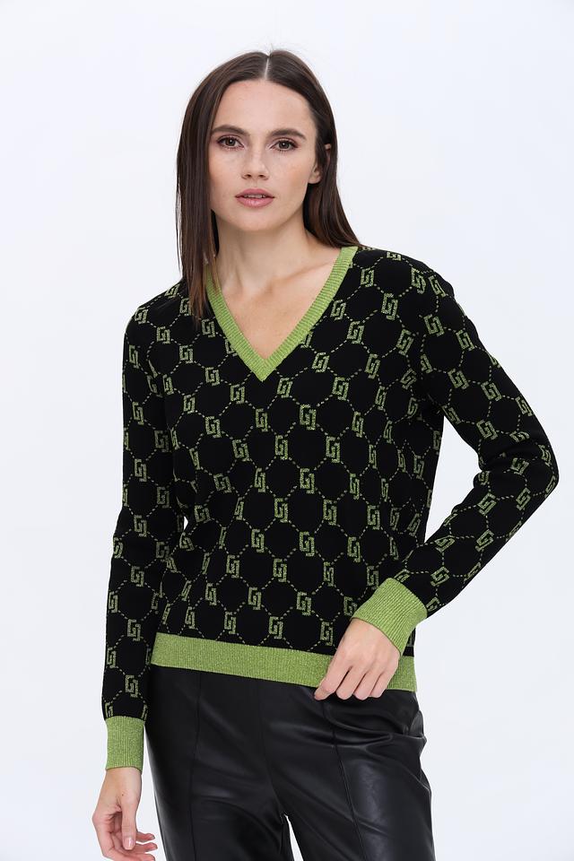 Женский джемпер Gaudi зеленого цвета с V-образным вырезом и геометрическим узором. Изготовлен из мягкой вискозы с добавлением полиэстера и эластана для комфорта и хорошей посадки. Состав: вискоза 53%, полиэстер 31%, эластан 16%