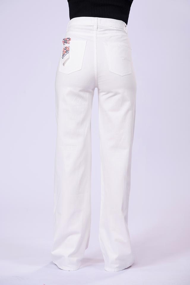 Брюки имеют высокую посадку и широкие штанины, создающие эффектный силуэт. Застежка на молнии и пуговицы обеспечивает надежную фиксацию. На задних карманах расположен оригинальный логотип бренда, выполненный в ярких цветах.