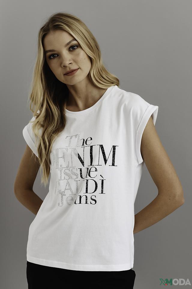 Модель имеет свободный крой и короткие рукава с манжетами, создающими эффект "крылышек". Передняя часть футболки украшена ярким принтом с надписью "The Denim Issue Gaudi Jeans".