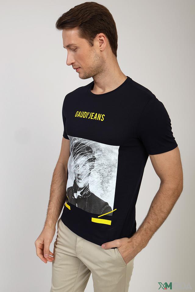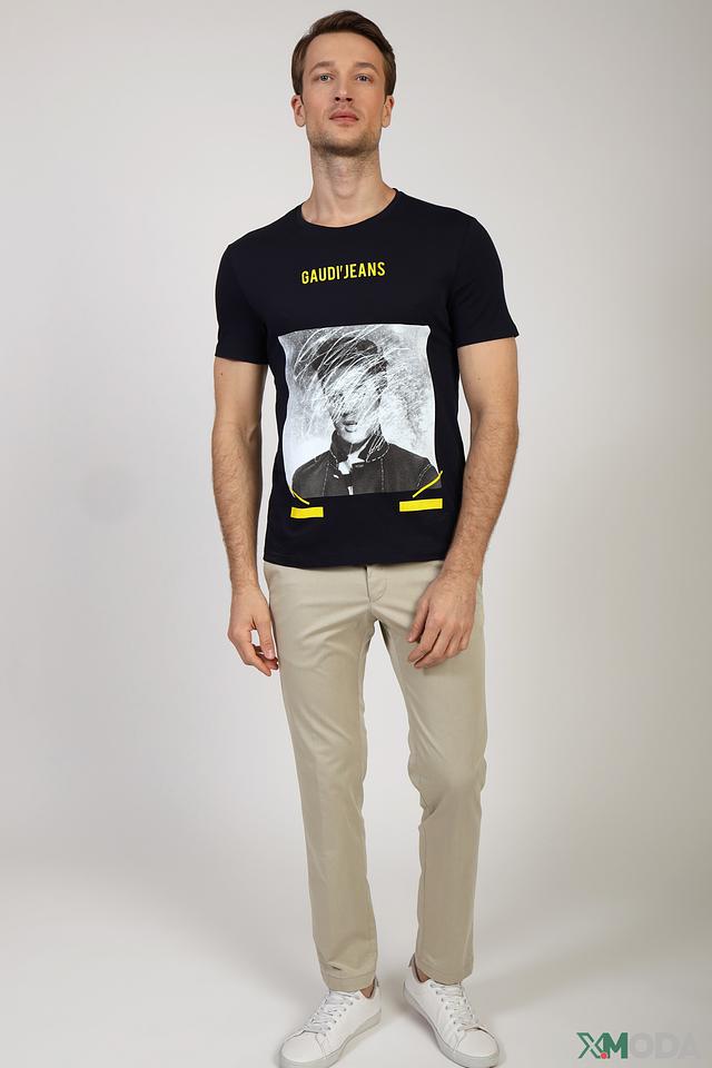 Особенности: Принт с изображением лица, надпись Gaudi Jeans, круглый вырез горловины, короткий рукав.