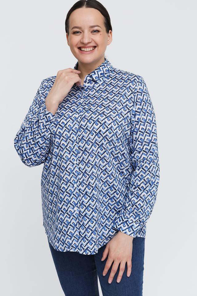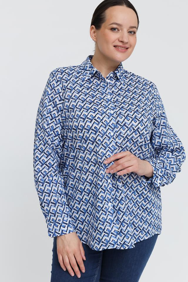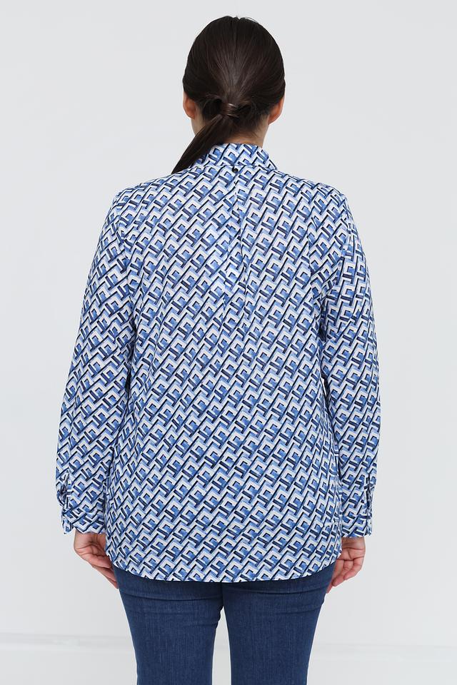 Рубашка имеет длинные рукава и классический крой, который подходит для различных типов фигур. Яркий геометрический принт в синих оттенках делает эту модель особенно привлекательной и оригинальной.