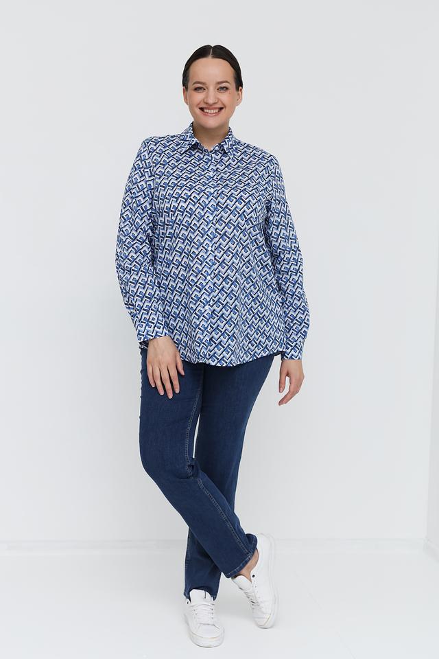 Женская рубашка Gerry Weber синего цвета с оригинальным геометрическим принтом. Модель выполнена из 100% органического хлопка, обеспечивающего комфорт и воздухопроницаемость. Состав: хлопок органич. 100%