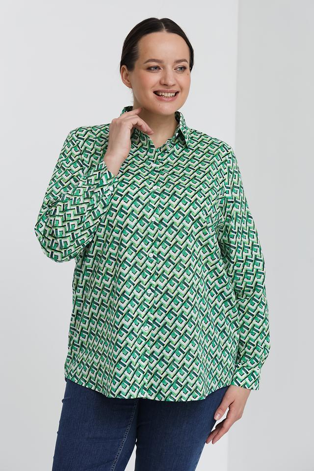 Рубашка имеет классический крой с длинными рукавами и отложным воротником. Особенностью модели является яркий геометрический принт в зеленых тонах, который добавит образу оригинальности.
