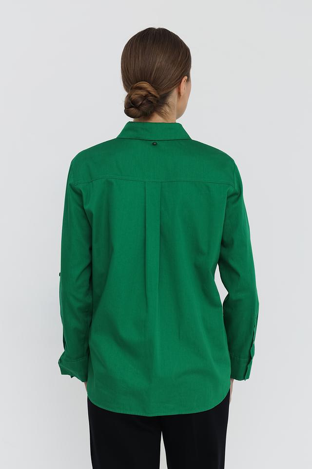 Рубашка имеет однотонную зеленую расцветку, которая легко сочетается с другими элементами гардероба. Застежка на пуговицы по всей длине обеспечивает удобство надевания и снятия. Прямой силуэт и аккуратный воротник придают рубашке элегантный вид.