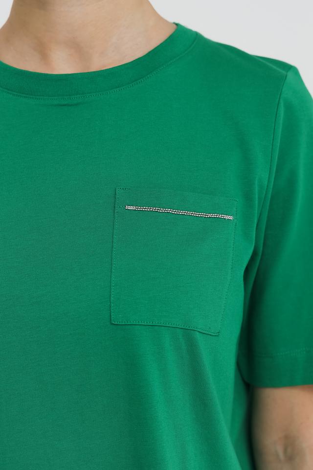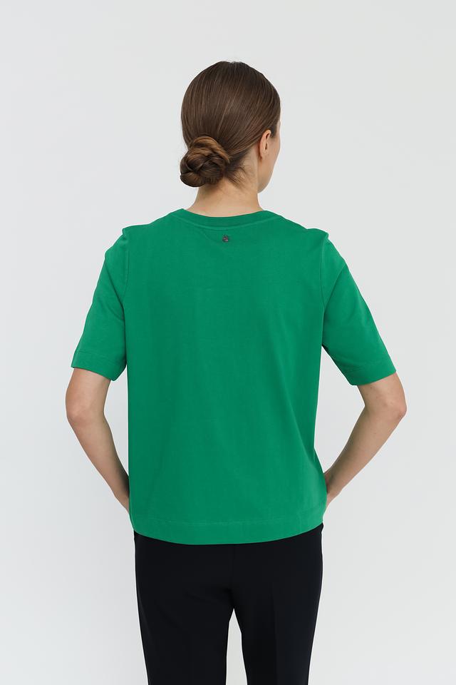 Футболка выполнена в насыщенном зелёном цвете, который легко сочетается с различными элементами гардероба. Она станет отличным дополнением к вашему образу, будь то повседневный стиль или более элегантный наряд.