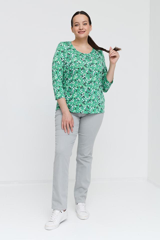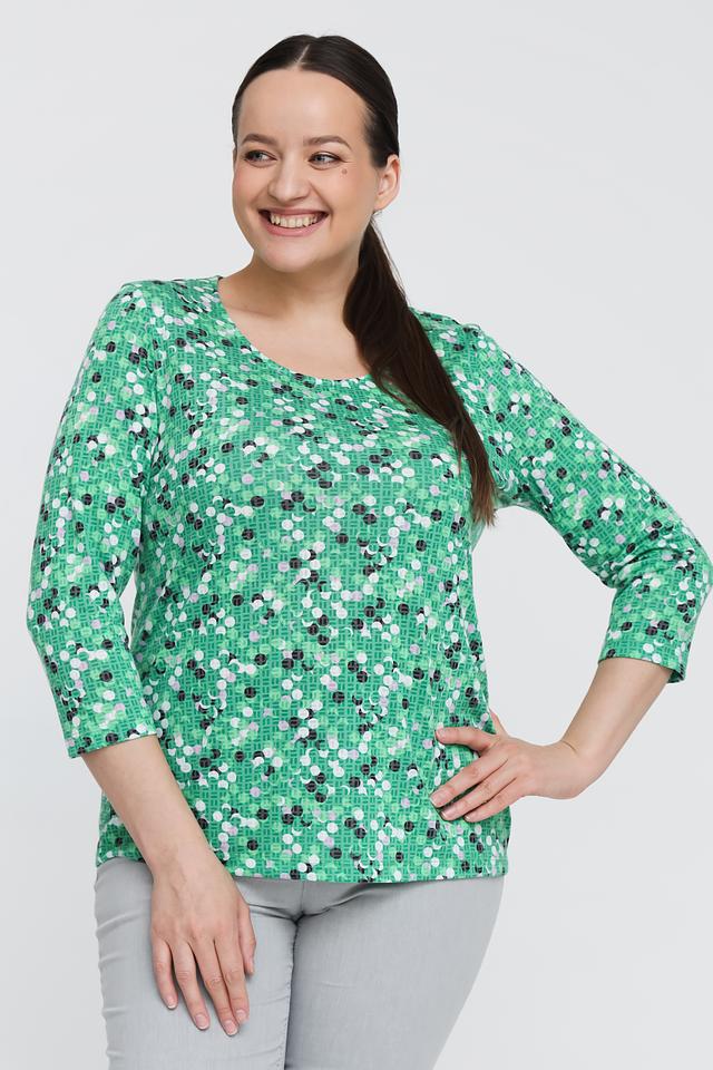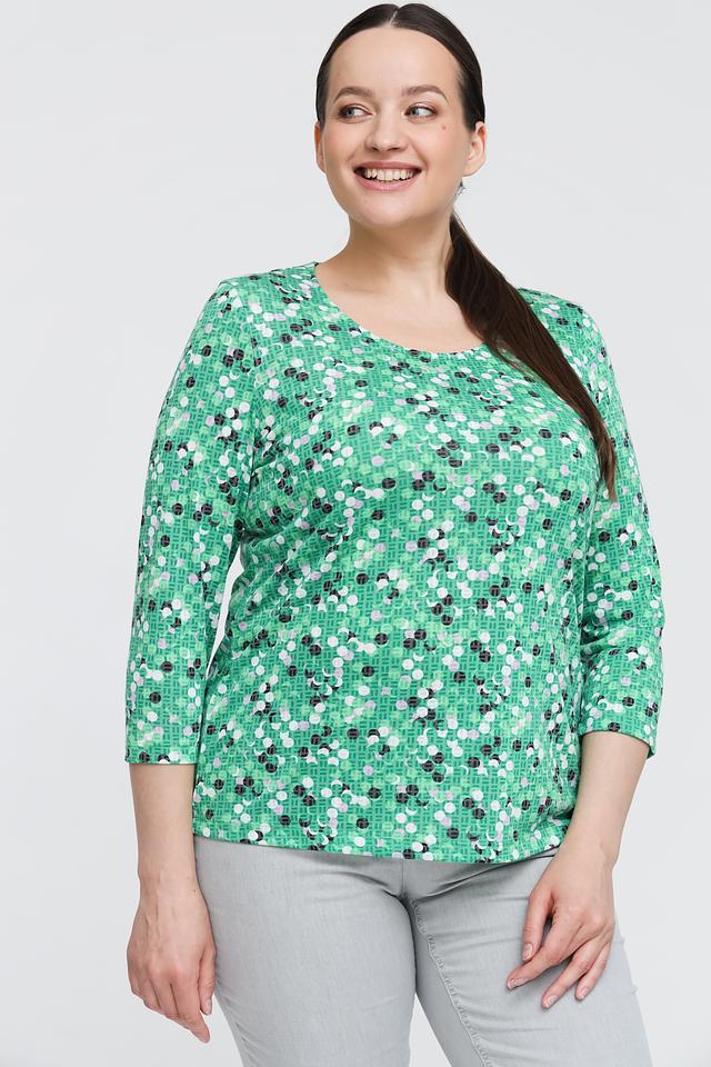 Женский лонгслив Gerry Weber зеленого цвета с оригинальным геометрическим принтом. Модель выполнена из мягкой ткани с добавлением переработанного полиэстера и вискозы, обеспечивающей комфорт в носке. Состав: переработ.полиэстер 65%, вискоза 35%