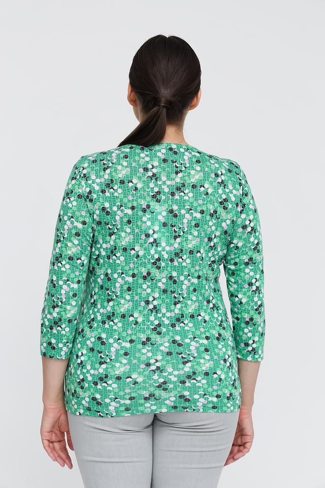 Лонгслив имеет прямой крой и длину до бедра, что делает его универсальным для создания различных образов. Зеленый цвет с ярким геометрическим принтом добавляет изделию оригинальности и свежести.