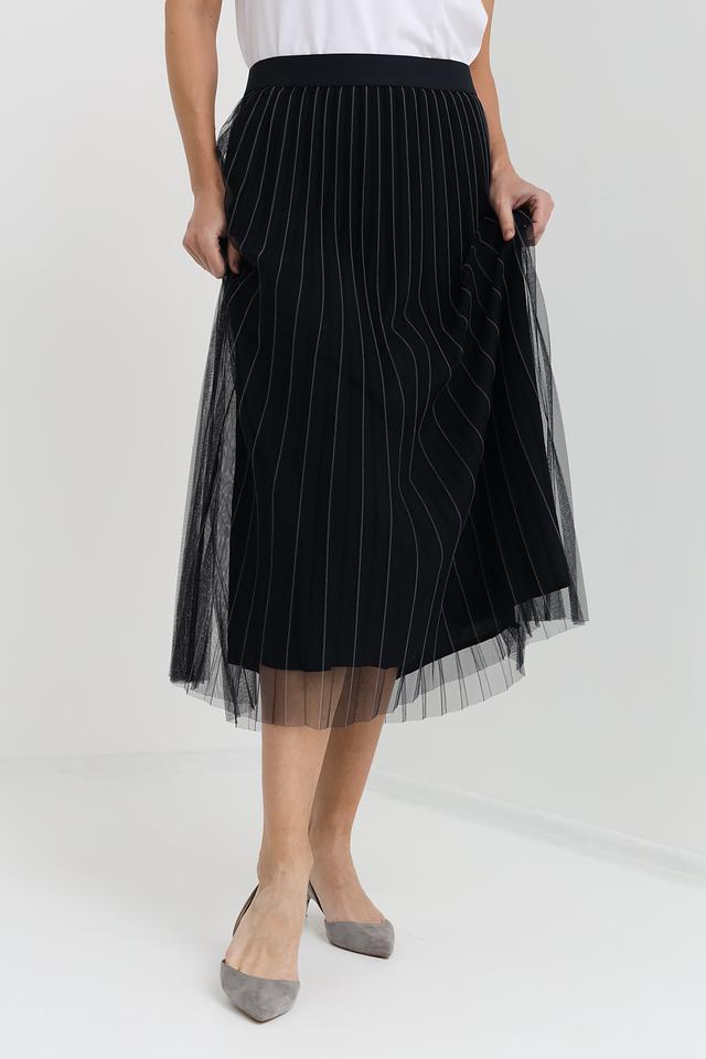 Юбка имеет длину миди и удобный эластичный пояс, обеспечивающий комфортную посадку. Дополнительный слой сетчатой ткани создает эффект многослойности и воздушности.